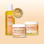 Le gel nettoyant élimine en douceur les impuretés et l’excès de sébum, préparant parfaitement la peau à recevoir les soins. Le masque à la rose, riche en actifs apaisants, calme immédiatement les rougeurs et les irritations. Enfin, la crème hydratante à la vitamine C scelle l’hydratation, protège la peau des agressions extérieures et révèle l’éclat naturel du teint.