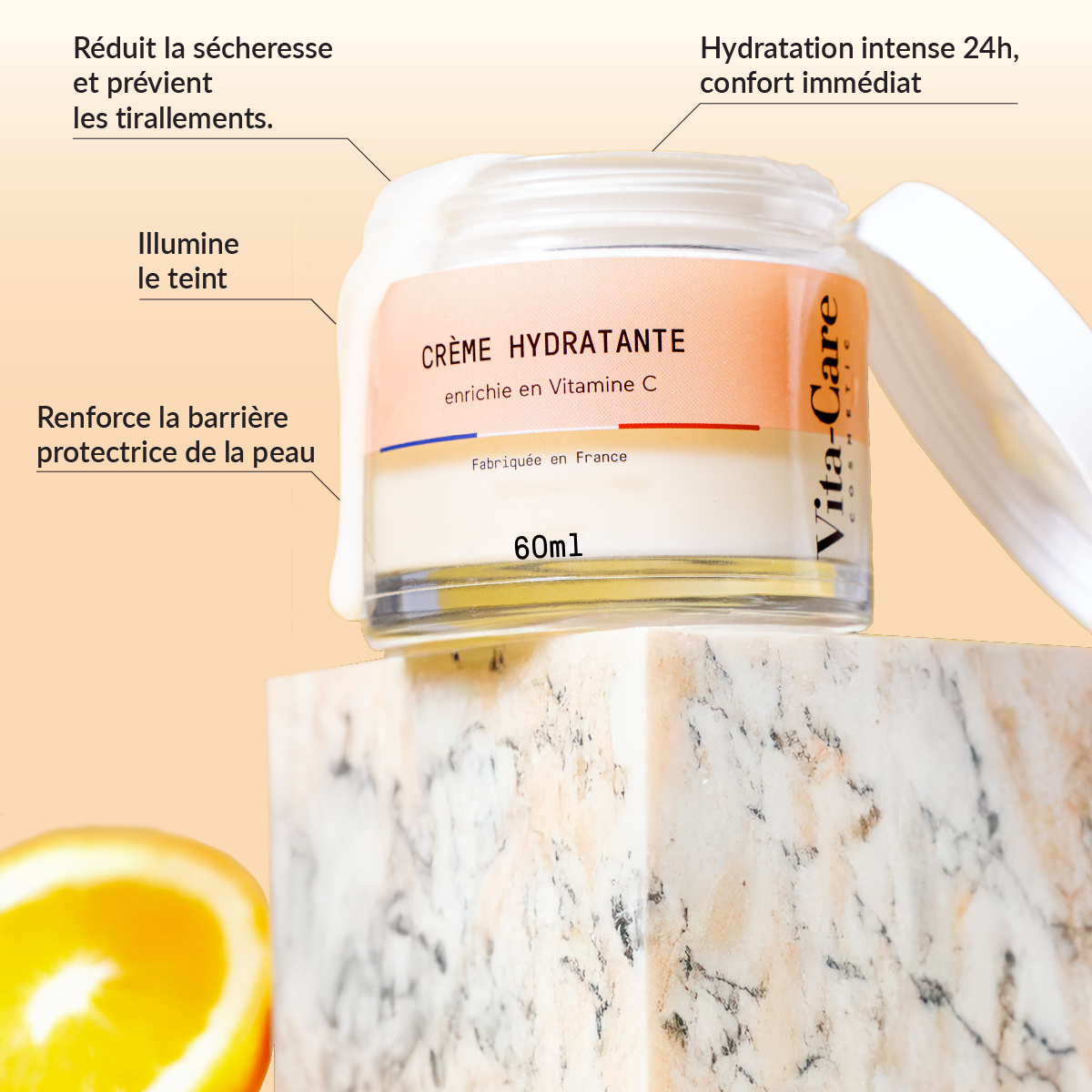 Notre crème hydratante complète nos soins du visage à la Vitamine C en enveloppant la peau d’une hydratation adaptée. Vous pouvez l’appliquer après le sérum, afin de sceller l’eau dans l’épiderme et prévenir la sensation de tiraillement. Sa texture souple pénètre rapidement, sans laisser de film gras. Vous allez aimer son confort immédiat, particulièrement lorsque votre peau paraît fatiguée. Chaque usage contribue à maintenir un teint plus uniforme et à lisser les traits de votre visage. Vous ressentirez alors une agréable douceur tout au long de la journée. Cette formule, enrichie en Vitamine C, sublime l’éclat, renforce et protège la souplesse cutanée, au quotidien.